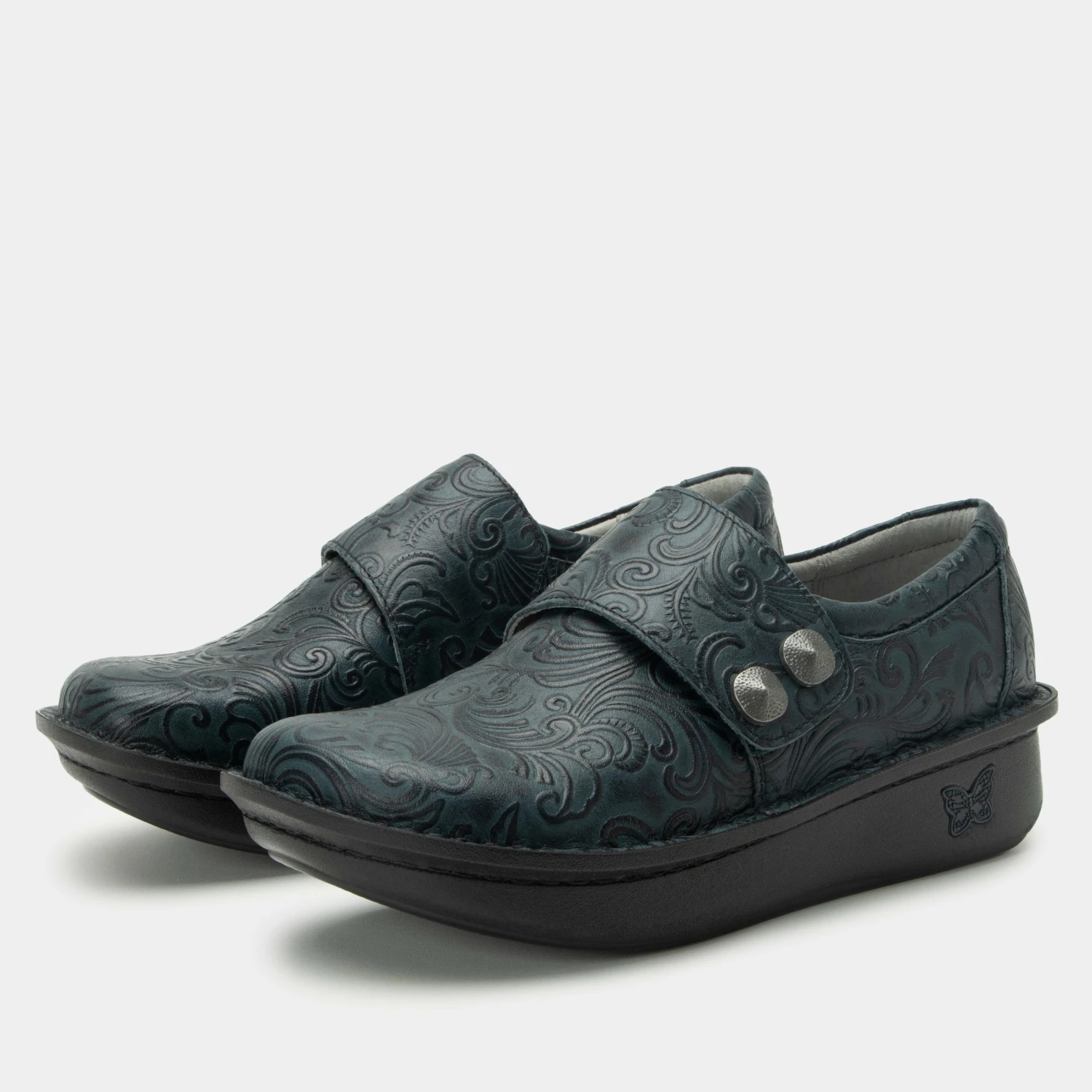 Stay sure footed in this adjustable hook-and-loop strap leather casual shoe dressed up with decorative artisanal hardware. A gently padded collar and ergonomically designed removable footbed made of memory foam and cork enhances its wearability. Underneath it all is a slip-resistant classic rocker outsole for nine-to-five comfort.