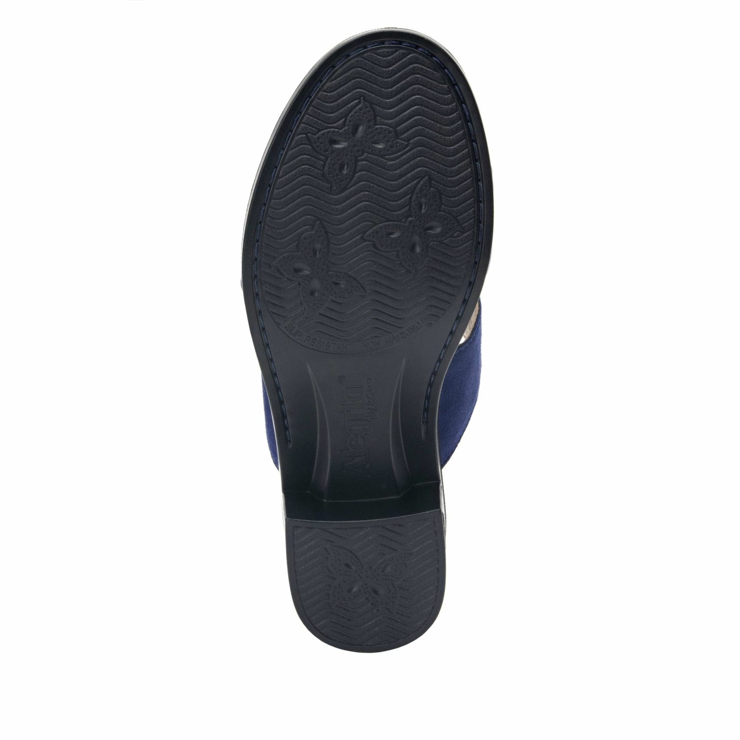 Featured in a richly colored Sapphire microsuede upper with matching microsuede footbed, detailed with a contrast topstitch.
