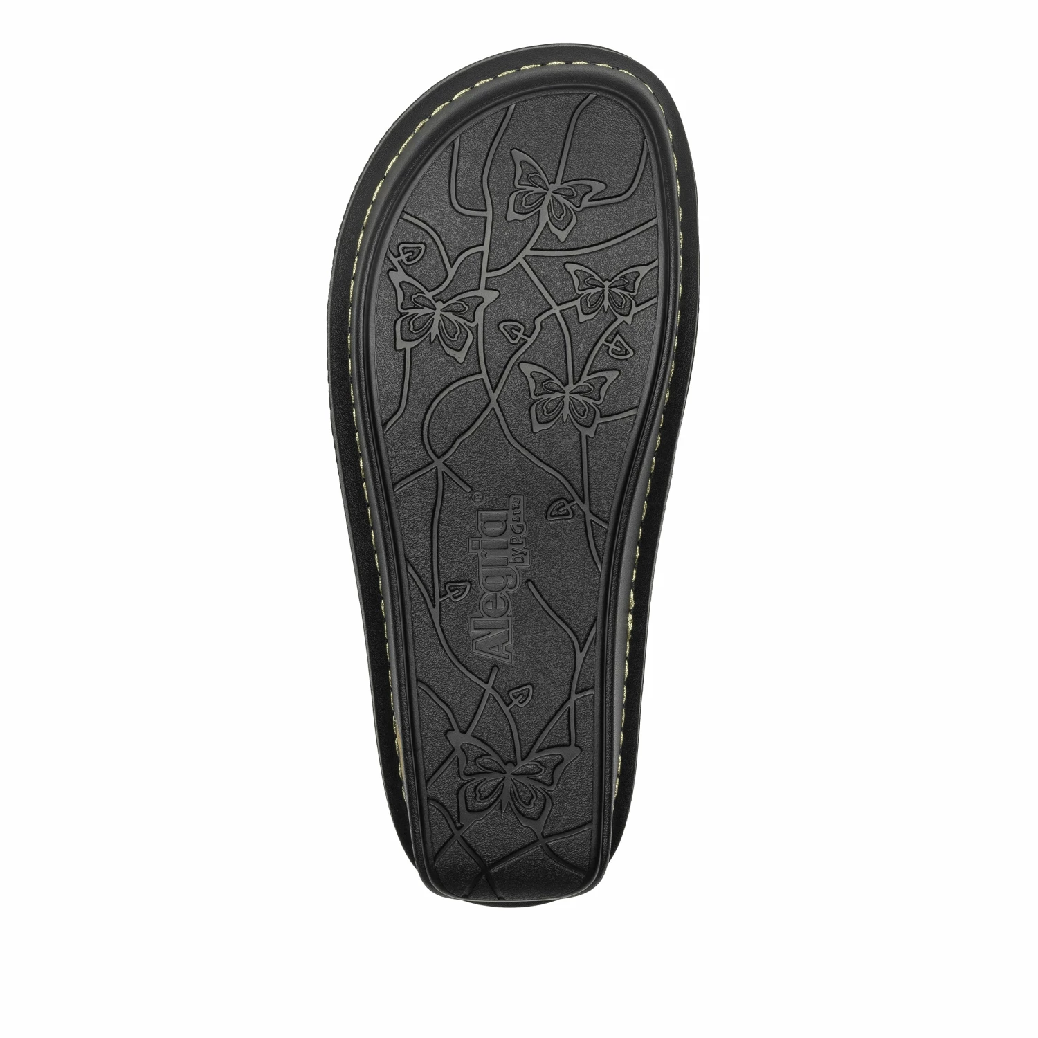 A crisscross slide with adjustable hook-and-loop leather instep strap takes a whimsical turn, trimmed with a novelty metal ornament. Underneath support and comfort is provided by a removable memory foam and cork footbed and mini outsole.