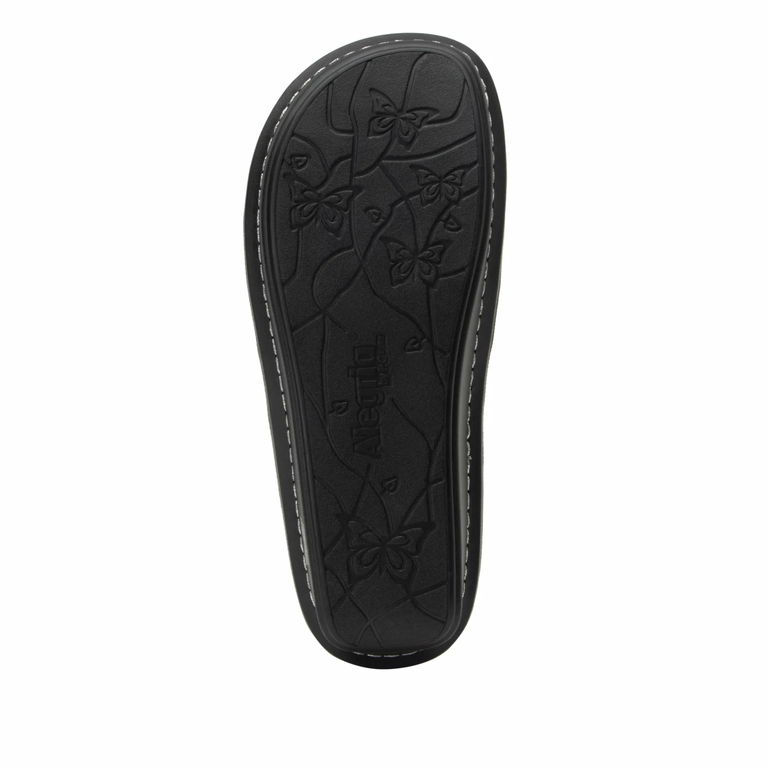 A crisscross slide with adjustable hook-and-loop leather instep strap takes a whimsical turn, trimmed with a novelty metal ornament. Underneath support and comfort is provided by a removable memory foam and cork footbed and mini outsole.