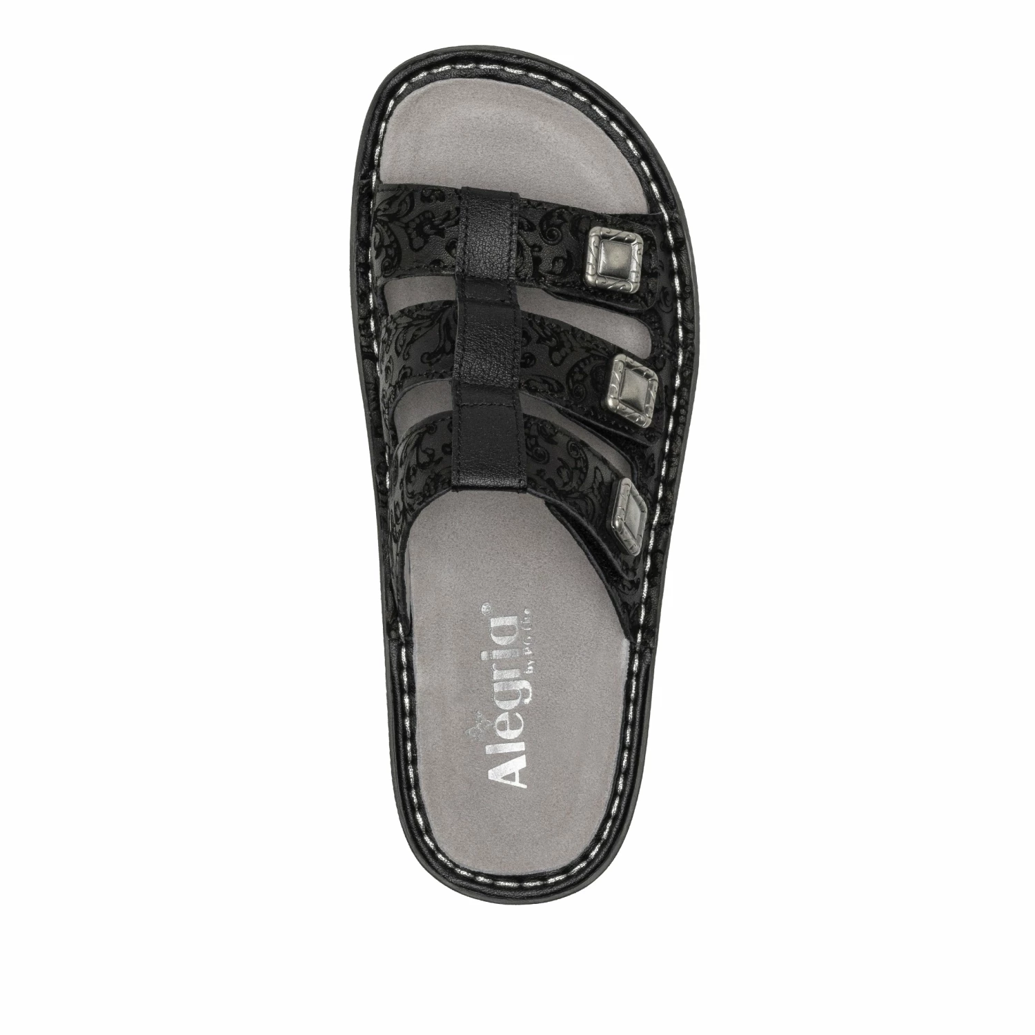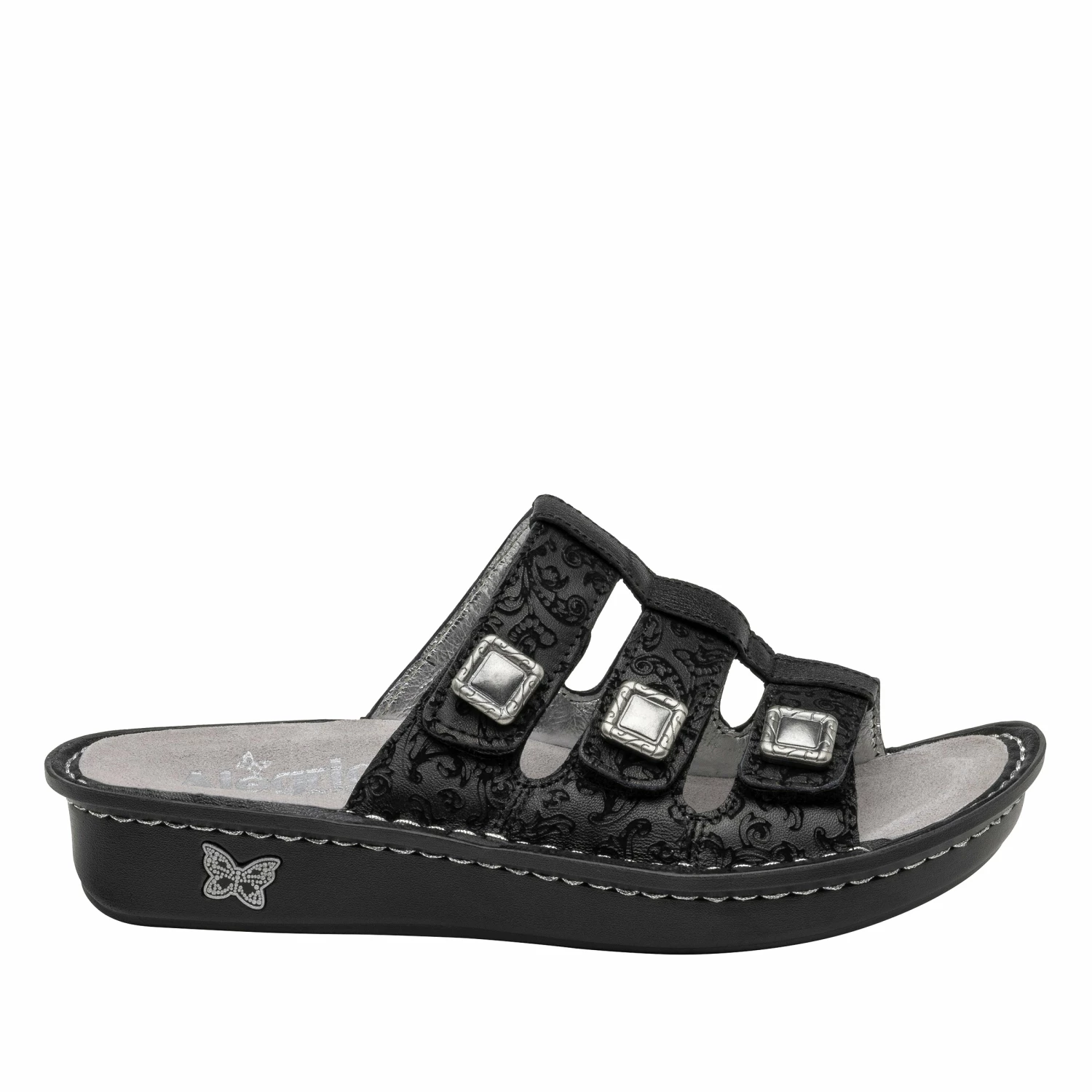 This multi-strap leather slide is super adjustable, incorporating a trio of hook-and-loop straps detailed with unique geometric ornaments. The Viera has a hand-stitched finishing on our Mini outsole. Made in leather upper and lining and underfoot is a patented removable footbed, which can also easily convert to medium or wide width.